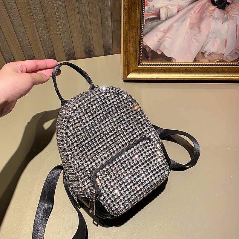 Acrylic Rhinestone Backpack for Women, Sparkling Diamond Pattern, Elegant Casual School Bookbag, Durable Zipper Closure, Solid Color, Lining, Do Not Wash - Black/Golden