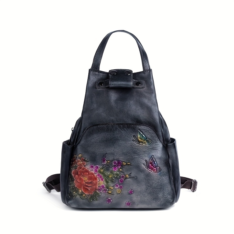 Vintage-Inspired Large Capacity Black Leather Backpack with Floral & Butterfly Design - Adjustable Strap, Zipper Closure, Polyester Lining, Urban Style, Trendy Fashion Backpack|Vintageinspired Backpack|Durable Backpack